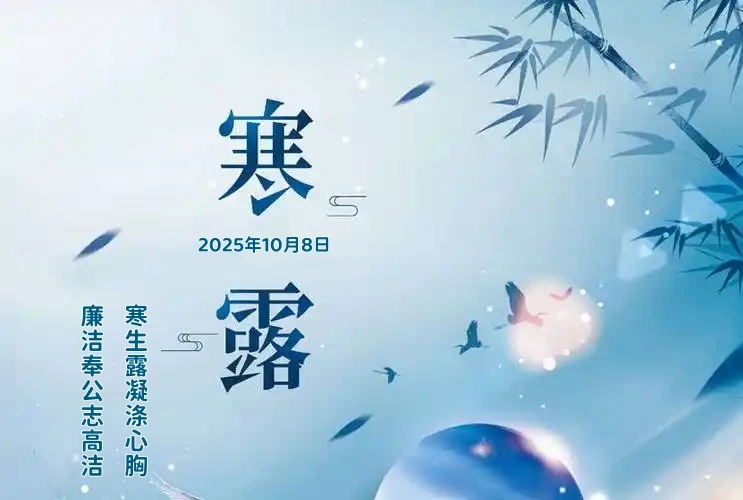 今日寒露,寒來露生,草木零落,晚秋意濃。俗語有云:“寒露寒露,遍地冷露?!焙豆?jié)氣是天氣轉(zhuǎn)涼的象征,露氣從潔白晶瑩轉(zhuǎn)為寒冷欲凝,標志著天氣由涼爽轉(zhuǎn)向寒冷。