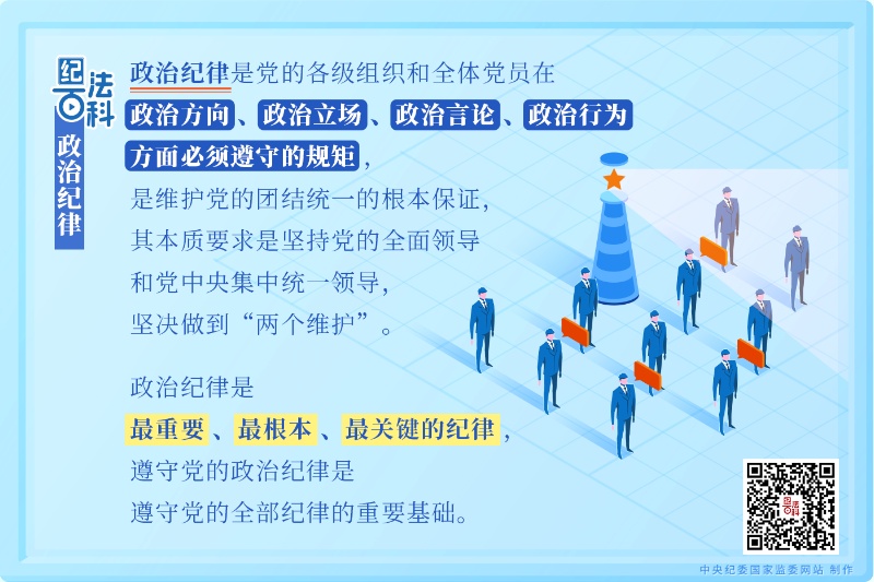 政治紀(jì)律是黨的各級(jí)組織和全體黨員在政治方向、政治立場(chǎng)、政治言論、政治行為方面必須遵守的規(guī)矩,是維護(hù)黨的團(tuán)結(jié)統(tǒng)一的根本保證,其本質(zhì)要求是堅(jiān)持黨的全面領(lǐng)導(dǎo)和黨中央集中統(tǒng)一領(lǐng)導(dǎo),堅(jiān)決做到“兩個(gè)維護(hù)”。