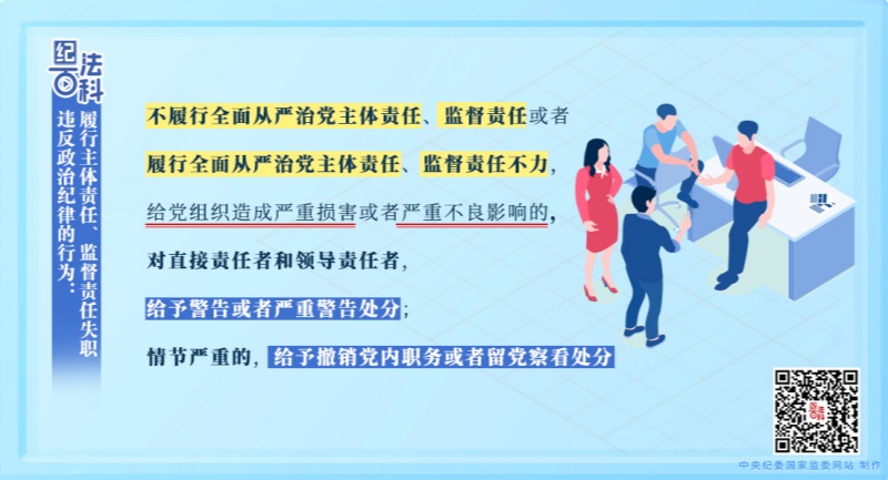 《中國共產(chǎn)黨紀(jì)律處分條例》第七十四條規(guī)定:不履行全面從嚴(yán)治黨主體責(zé)任、監(jiān)督責(zé)任或者履行全面從嚴(yán)治黨主體責(zé)任、監(jiān)督責(zé)任不力,給黨組織造成嚴(yán)重?fù)p害或者嚴(yán)重不良影響的,對直接責(zé)任者和領(lǐng)導(dǎo)責(zé)任者,給予警告或者嚴(yán)重警告處分;情節(jié)嚴(yán)重的,給予撤銷黨內(nèi)職務(wù)或者留黨察看處分。