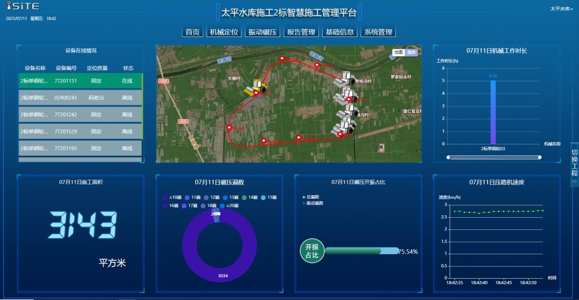 太平水庫碾壓施工智慧管控系統(tǒng),通過在碾壓機械上安裝北斗定位天線、VCV傳感器以及終端顯示平板,實時監(jiān)控碾壓機械的軌跡、速度、遍數(shù)、是否開振等指標(biāo),對攤鋪及碾壓進行全過程數(shù)據(jù)采集、傳輸、統(tǒng)計分析、智能反饋和三維動態(tài)施工仿真模擬,并借助現(xiàn)場采集的施工參數(shù),對施工質(zhì)量進行快速評價與控制。